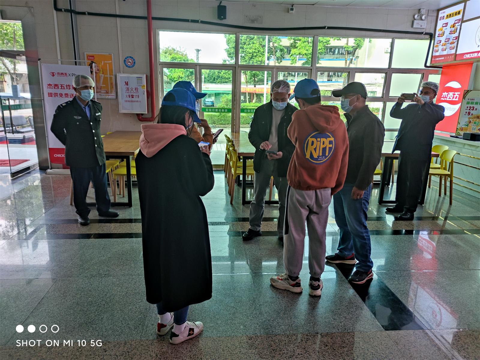 彭日新一行对校外北门食街所有店铺的疫情防控工作落实情况进行了检查,重点检查各店铺的负责人和工作人员参与全员核酸检测、疫苗接种等情况,并对他们的粤康码、行程卡进行细致核实是否存在异常情况,同时进行疫情防控工作宣传教育,要求他们必须佩戴口罩,积极全力配合和参与疫情防控工作。
