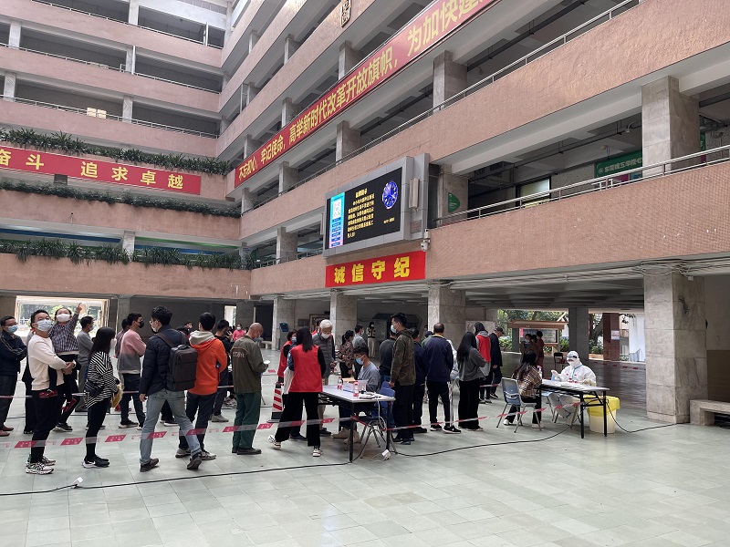 下午3时许,各组采样医护人员准备好物资后开始进行采样,现场采样工作有序进行。参检人员全程佩戴口罩,有序排队,按照登记信息、分组候检、采样的程序,在工作人员的指导下有条不紊地推进核酸检测工作,对于行动不便的退休教职工也提供了上门采样服务,做到应检尽检、不漏一人。检测结束的人员自觉迅速离开,不扎堆、不聚集,现场秩序井然有条,截至核酸检测工作结束,共计采集样本500份。