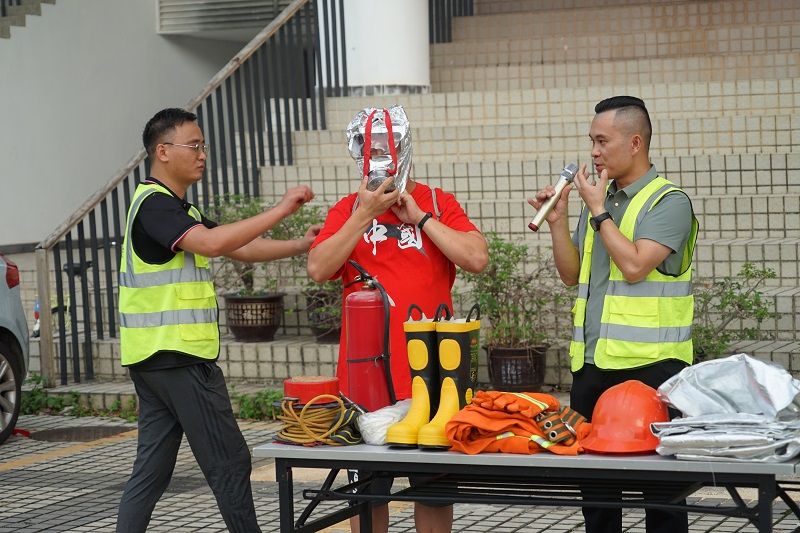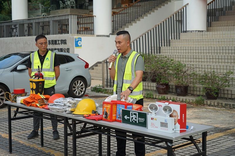在实操演练之前,管委会邀请消防维保公司专业人员向大家讲解了消防安全工作方针、学生宿舍用电安全规范、燃烧的条件、初级火灾扑救方法、疏散逃生方法等方面的理论知识,以及灭火器、防毒面具、消防服、灭火毯、逃生绳等等常见消防自救逃生用品的检查与使用方法,让大家详细地了解了日常工作和生活中需要注意防范的致灾因素和发生火灾后的自救逃生技能。