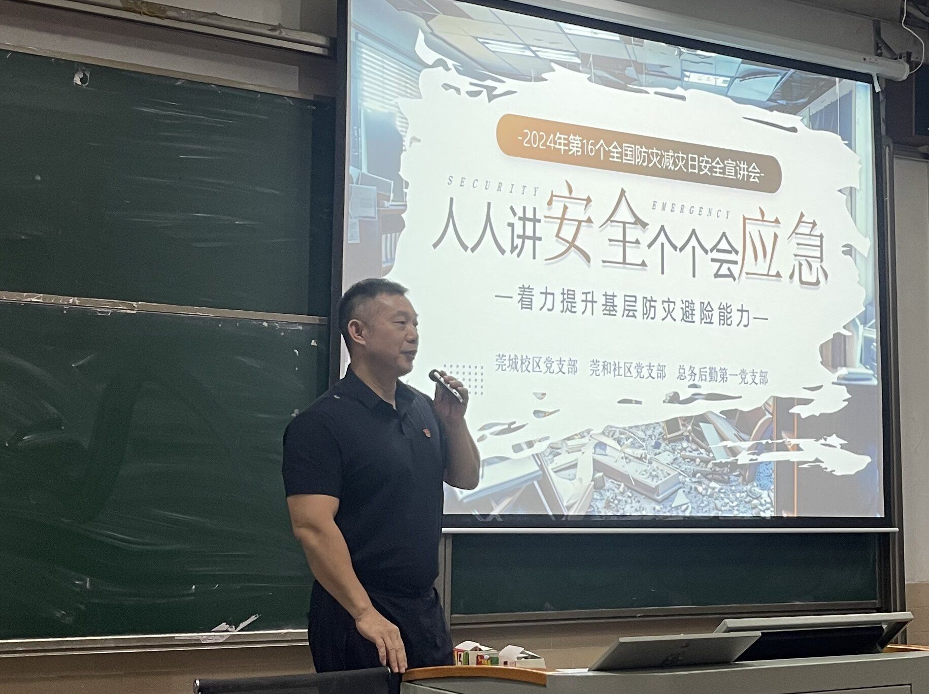 为做好2024年全国防灾减灾相关工作,5月16日下午,sunbet申博党支部、莞和社区党支部、总务后勤第一党支部在6号阶梯1室联合开展主题为“人人讲安全、个个会应急——着力提升基层防灾避险能力”防灾减灾宣讲活动。安保部副部长、sunbet申博管委会专职副主任、sunbet申博党支部书记王平,经管学院党委负责人、莞和社区党支部书记黄湘,以及师生代表参加。